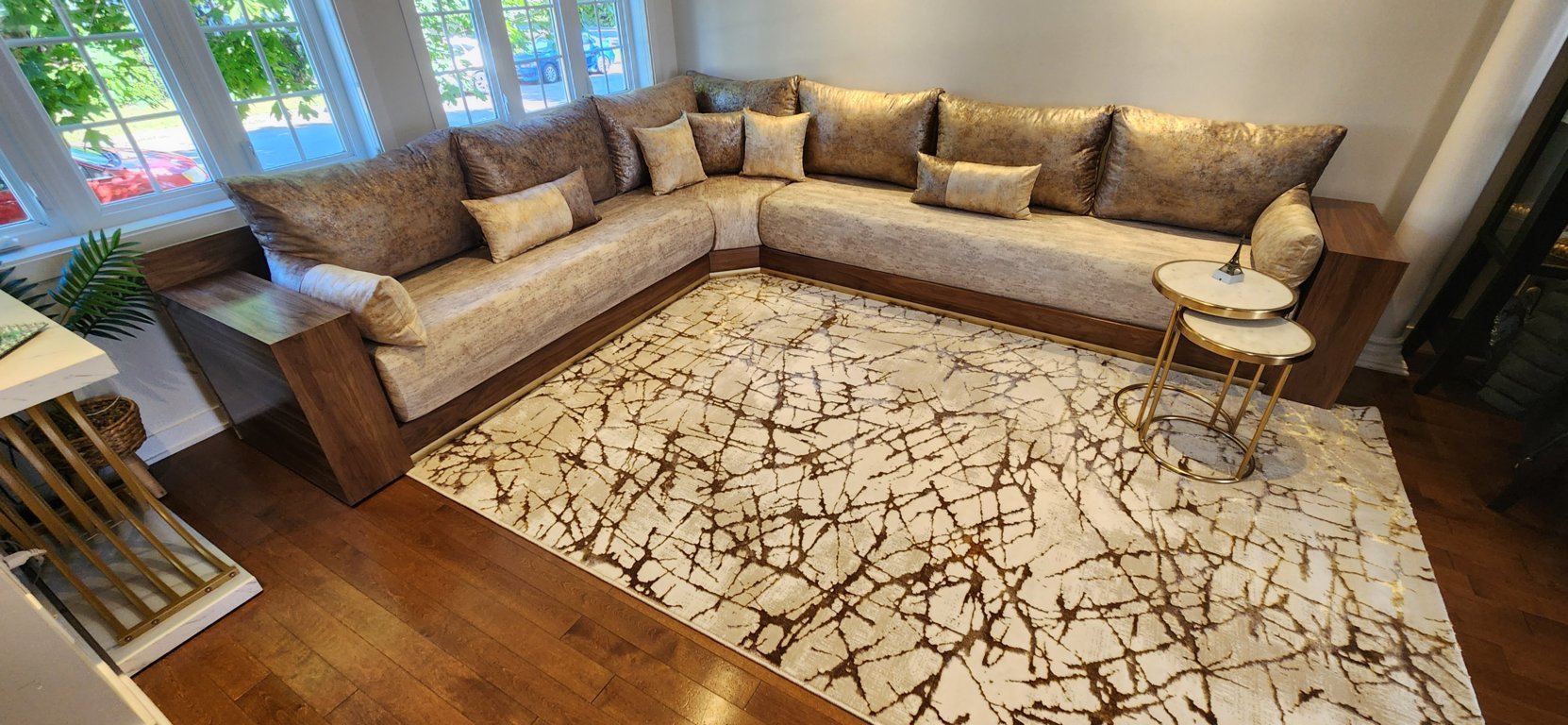Ce salon marocain contemporain incarne l’élégance et le confort, parfait pour un intérieur moderne et raffiné. Sa structure en bois massif aux finitions naturelles s’harmonise avec un tissu texturé beige et marron, créant une ambiance douce et chaleureuse.
